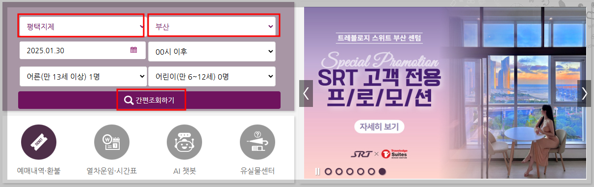 화면의 좌측 코너에 [간편조회하기]화면에서 [출발역 / 도착역 / 출발일]을 설정해 보세요.