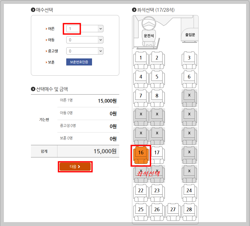 원하는 시간대의 버스를 선택하면, 화면에 보이는 것처럼 좌석 선택을 의자 이미지 중