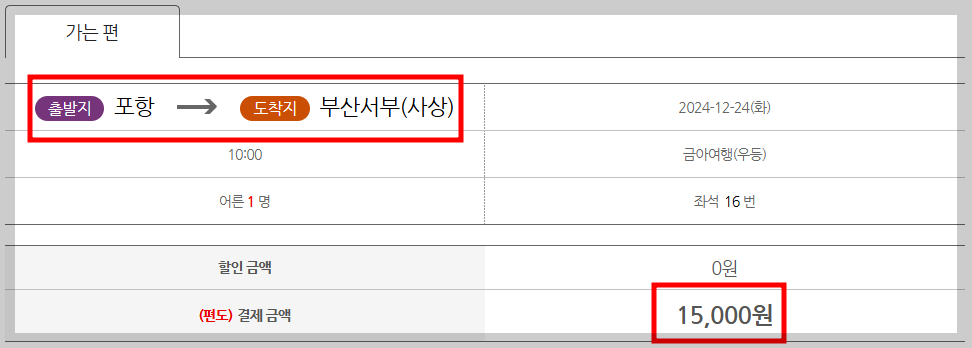 □ 요금: 일반 25,000원 / 우등 34,000원