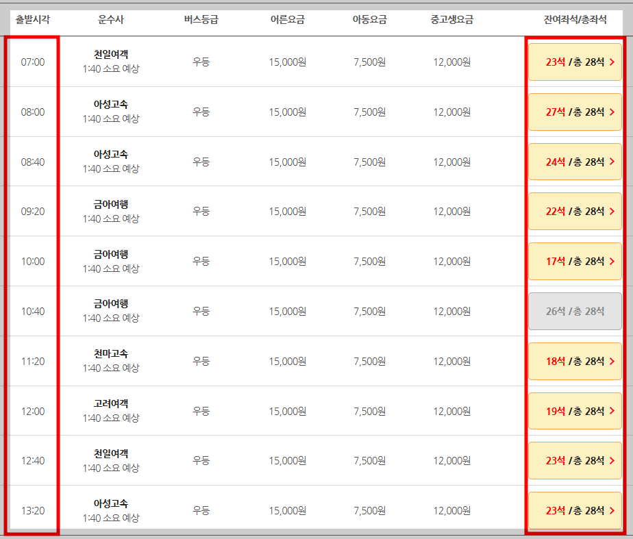 3️⃣ 출발이 가능한 시간대를 확인 및 잔여좌석을 체크합니다.